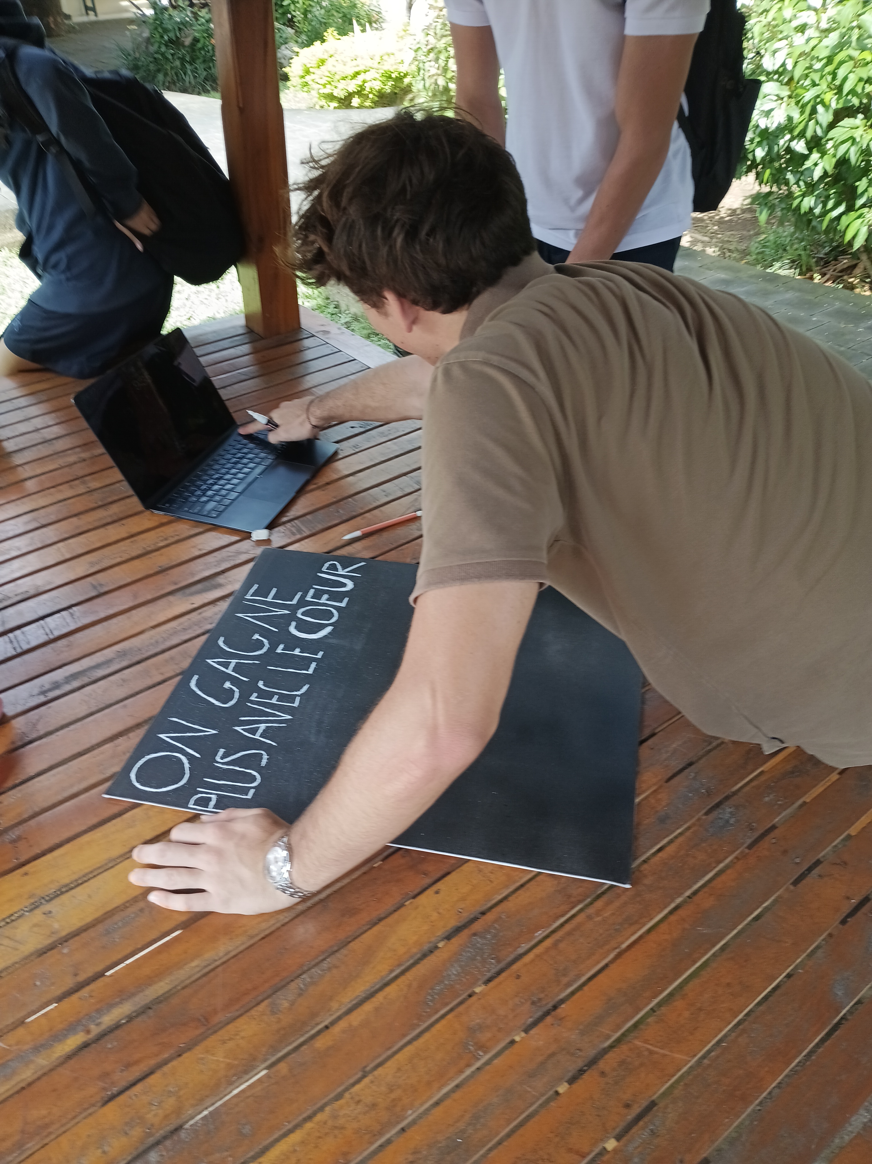 J’avais fait une petite activité en classe quelques jours auparavant pour se mettre dans le bain avant la sortie. J’avais acheté des toiles et des bombes de peinture noires. L’idée était de créer des messages en français à la manière de l’artiste BEN pour montrer que l’écriture joue un rôle aussi important dans le street art que les dessins, les collages et autres formes d’oeuvres. Certains élèves ont crée leur propre message, d’autres ont repris des citations de personnes célèbres.